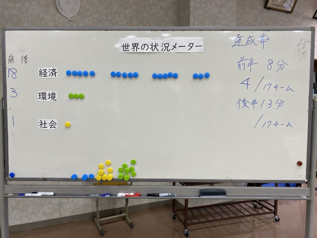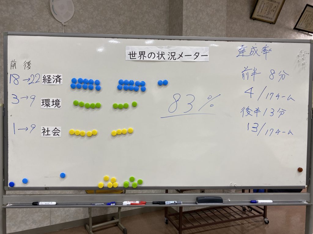 - 各自の目標到達具合と世界の状況メーターから考えると、ゲームの達成率は83%(講師による採点)。