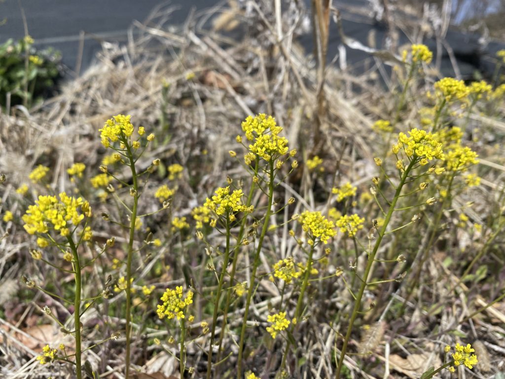 土手や空き地でよく見かけます。名前がわからなかったのですが、「ナズナっぽいな」と思い検索してみたところ、どうやらこれは「イヌナズナ」という名の花のようです。
