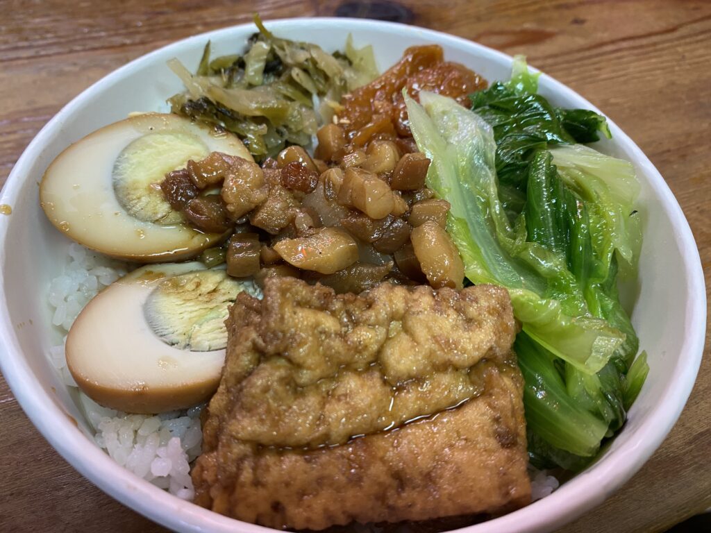 商店街の中で行列のできている店を選び、入店。魯肉飯が看板メニューのようだったので、魯肉飯(110元)を注文。野菜も採れて満足度の高い昼食でした。