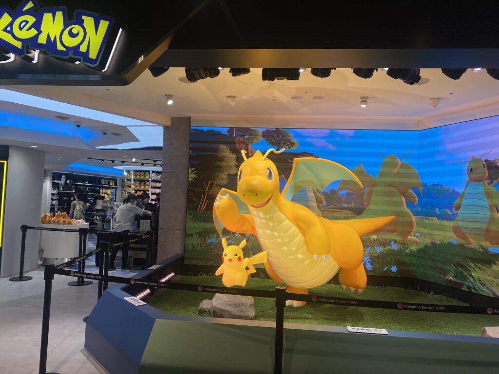 市政府駅を出て徒歩5分ほど歩くと、ポケセンの入っているデパート「新光三越」に到着。エスカレーターで3階まで上ったら、カイリューとピカチュウがお出迎え! 台湾に来て最もテンションの上がった瞬間でした。