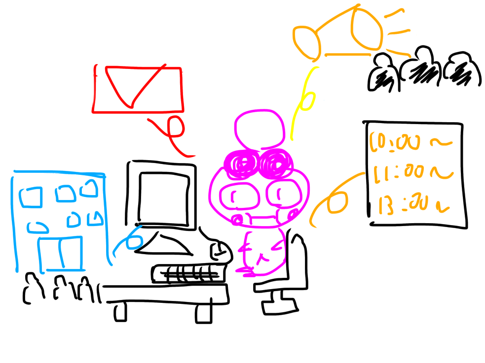 机の配置や、ホワイトボード・スクリーンの位置確認、さらにマイクの音量調節も行いました。受付のオペレーションもこのときに確認しました。