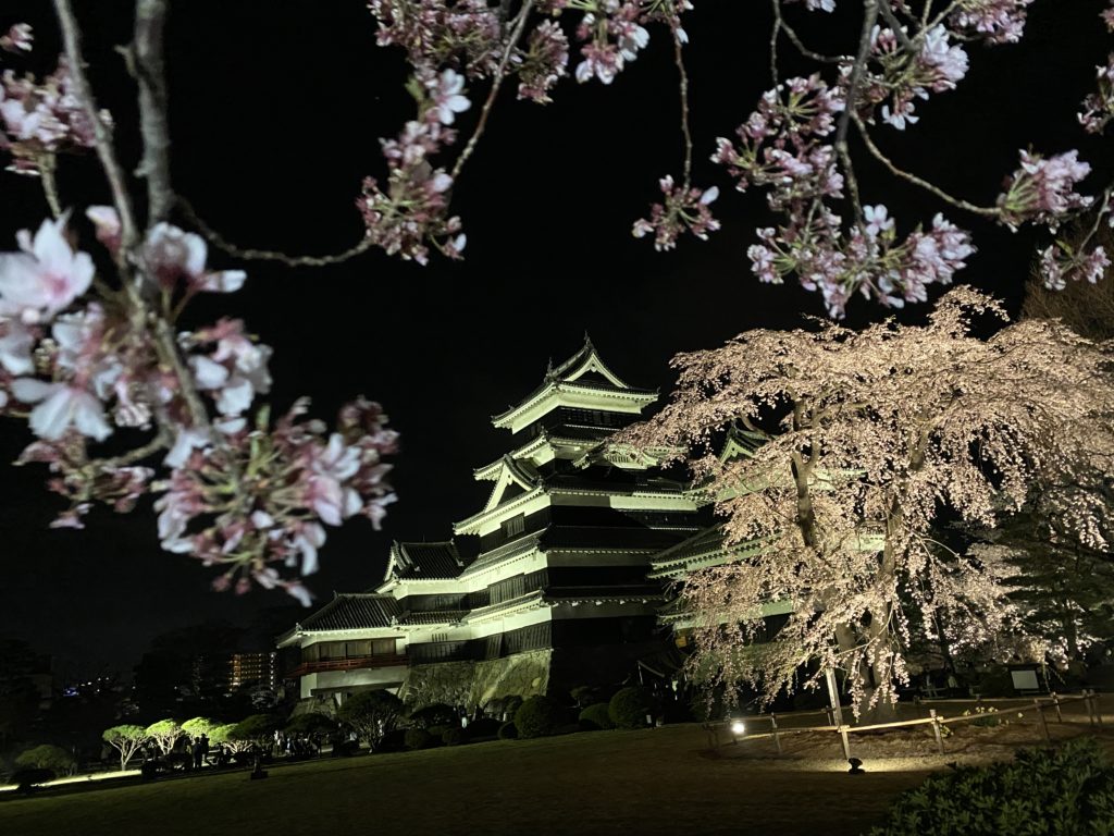 毎年恒例、松本城の夜桜会。ライトアップされた松本城とともに夜桜を楽しむことができます。通常は有料の本丸庭園が、無料開放されます。