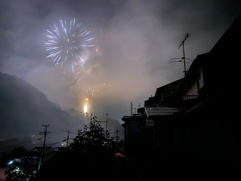 木曽は「木曽谷」と呼ばれることからもわかるように、谷底に作られた町です。谷、つまり、山に囲まれているので、花火の打ち上げ音が山に反響して、大迫力でした。