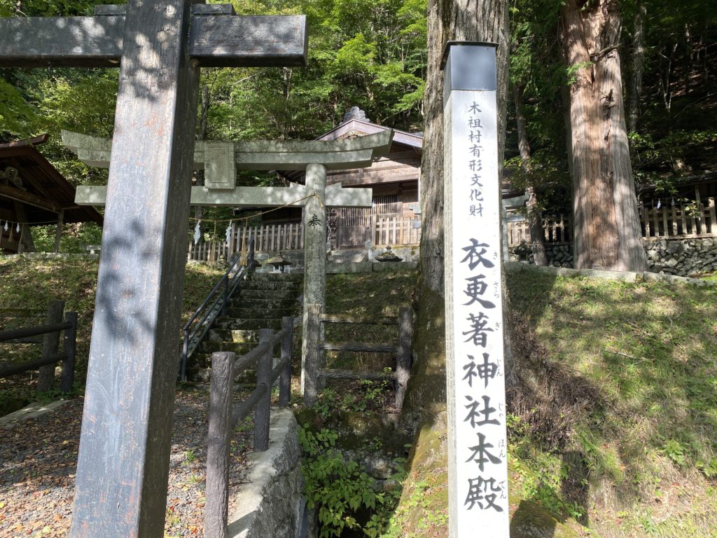 着更著(きさらぎ)神社は木祖村の有形文化財に指定されている神社です。社殿のすぐ後ろに控える山の緑が美しく、神聖な空気を感じます。