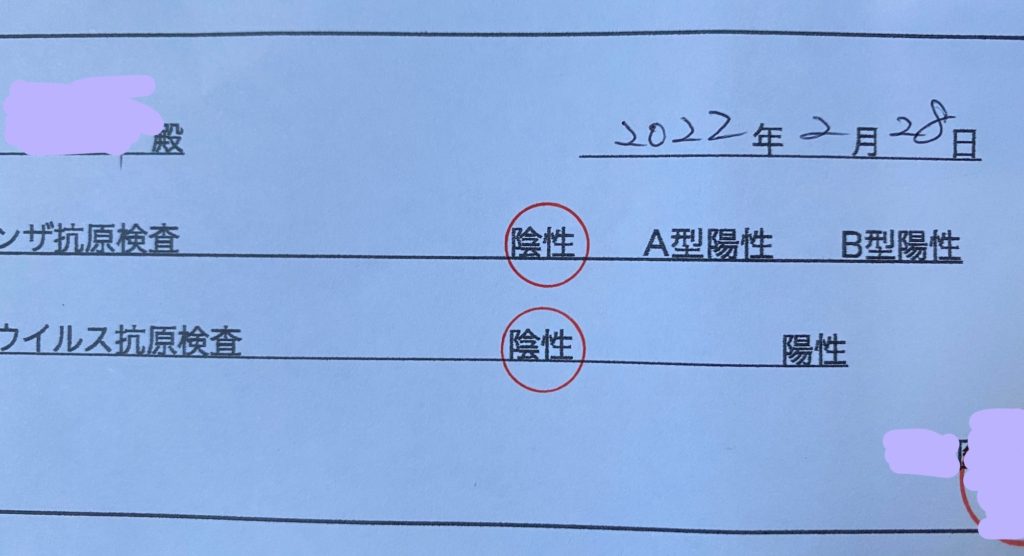 苦労して病院を受診した結果は、新型コロナもインフルエンザも陰性。ただの風邪ということでした。ただし、症状が軽いうちは「陰性」で、数日後に「陽性」になることもあるので、熱のあるうちは人とは会わないように、と言われました。