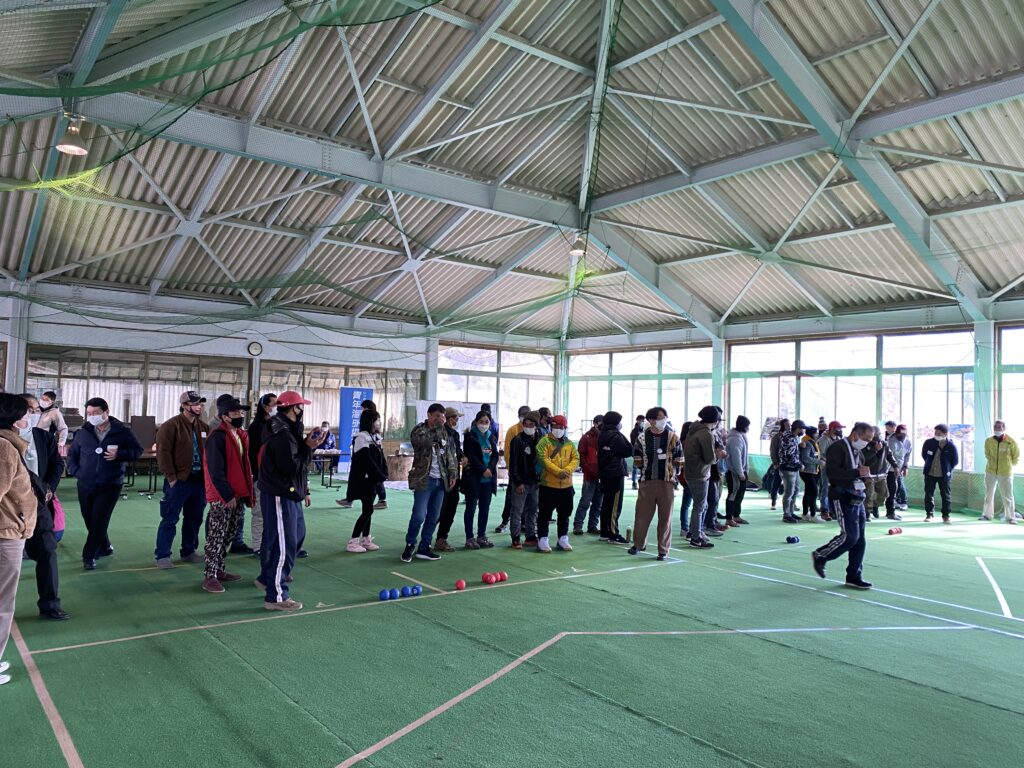 餅がつきおわったら「ボッチャ」というゲームを行いました。実習生を6人のチームに分け、グループリーグ戦+トーナメント戦で行いました。各チームにはサポートで、青年海外協力隊OB会のメンバーが1人ずつ入りました。